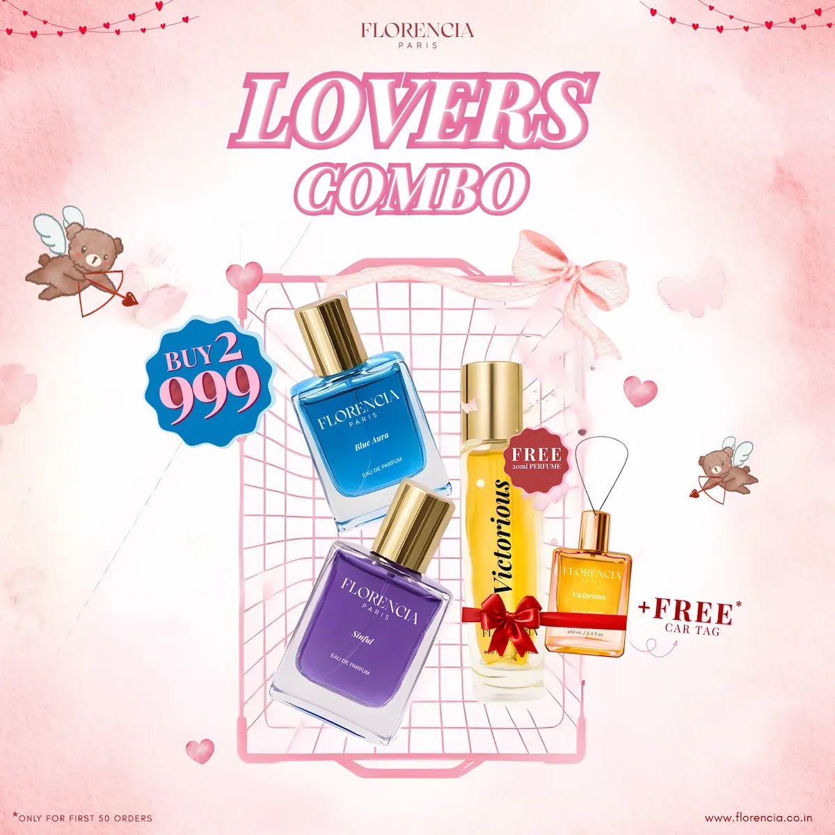 Florencia Paris Lovers Combo – Blue Aura & Sinful Eau de Parfum with Free Victorious 20 ml Perfume & Luxury Car Tag